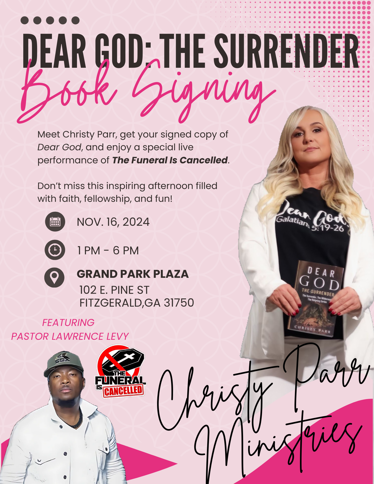We’re excited to announce that Christy Parr, author of "Dear God: The Surrender," will be hosting an exclusive book signing event in her hometown of Fitzgerald, GA. This unique event will be held in conjunction with Pastor Lawrence Levy, Senior Pastor at Freedom World Ministries, who will perform his powerful show, The Funeral Is Cancelled, onsite.